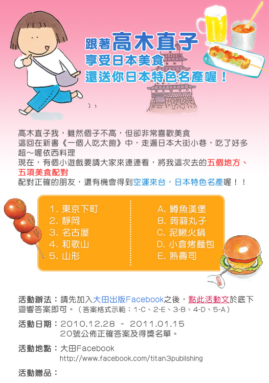*免費送高木直子新書《一個人吃太飽》,教你成為日本美食通!-Yahoo!奇摩新聞 http://tw.news.yahoo.com/article/url/d/a/101229/56/2jv57.html