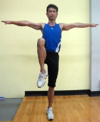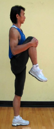雙手慢慢把一條腿帶向身體,盡量貼緊,保持平衡停留10~20秒。停留後先用腿與腹部力量把腳停留在原位,再將手慢慢放掉,腳再慢慢放下。換另一條腿做,左右重複2~3次。