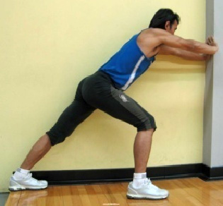 找一面牆,手推牆。一腳膝蓋打直後拉,腳跟貼地,腳踝約傾斜45度,身體保持一直線,停留10~20秒,左右重複2~3次。