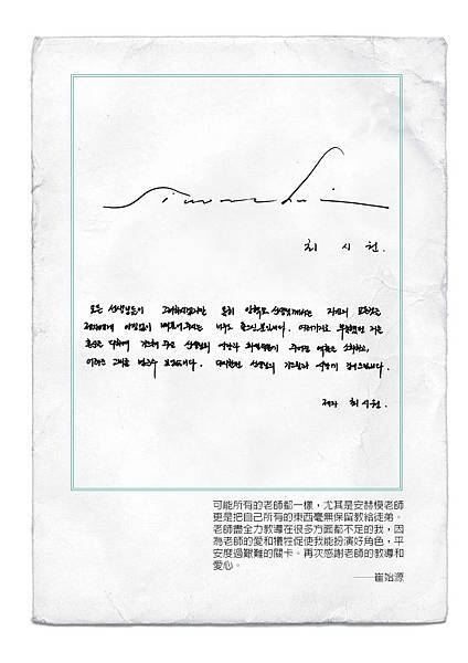像始源這樣,各種時間等各方面都不足的情況下,如果懷疑老師、時時表現自己的色彩而輕視教導,可能只會疲憊而毫無成果的。可是,始源真的完全的信任教導自己的老師,以毫無懷疑的純淨眼神,看著老師的孩子,因此才會有所成果的。