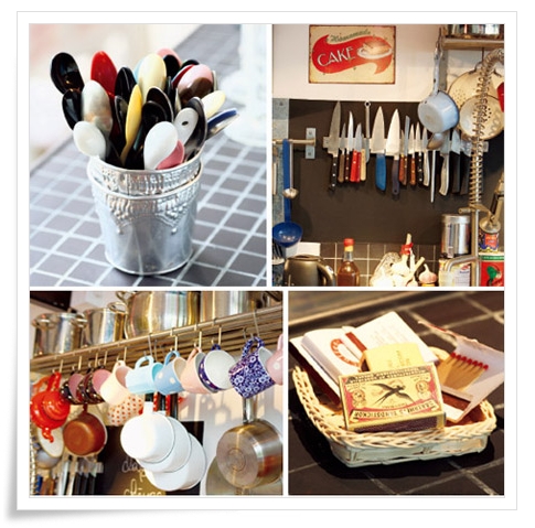 牆面貼有磁鐵式刀具收納板,方便收納刀子。看似不起眼的火柴盒也是具有畫龍點睛之效的裝飾品。