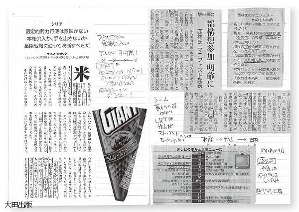 在寫下小說的創意點子後,接著是關於育兒休假制度的剪報或是英語教學書